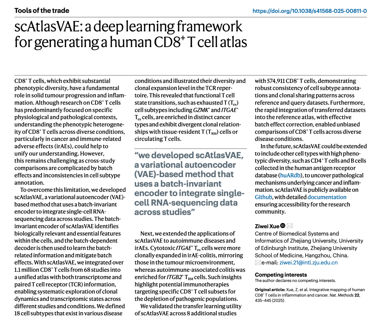 浙江大学刘琬璐实验室刘琬璐课题组博士生薛子为受邀在《Nature Reviews Cancer》发表题为scAtlasVAE: a deep learning framework for generating a human CD8+ T cell atlas的Tools of the trade短综述,阐述了基于深度学习整合算法scAtlasVAE在构建人CD8+ T细胞参考图谱的应用。