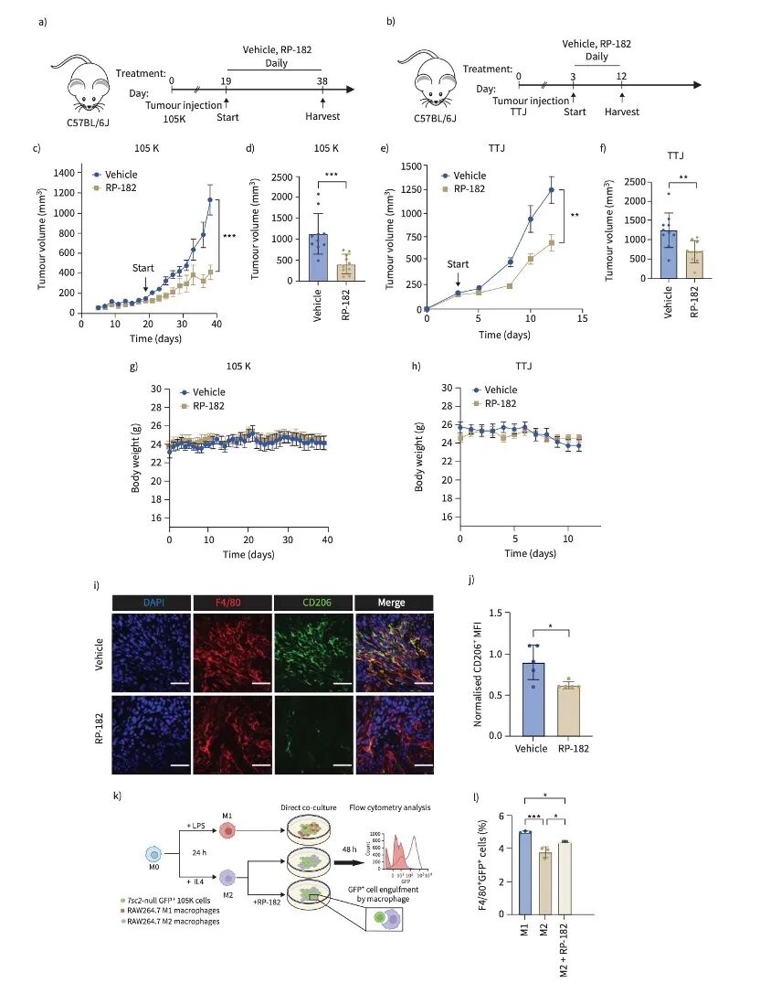 为了进一步验证这一作用机制,研究团队建立了TSC2缺失细胞与人源或小鼠来源巨噬细胞的直接共培养模型,用于评估肿瘤细胞对巨噬细胞分化的影响。实验结果表明,在共培养条件下,巨噬细胞显著上调了M2型相关的分子标志,呈现出典型的免疫抑制性表型。此外,为评估靶向M2型巨噬细胞的治疗潜力,研究团队在TSC2缺失皮下肿瘤的小鼠模型中引入RP-182进行干预。RP-182是一种能够重编程巨噬细胞、促其转化为抗肿瘤M1型表型的合成肽。结果显示,RP-182治疗显著抑制了肿瘤的生长,表明通过调控巨噬细胞表型可望成为LAM治疗的新策略。