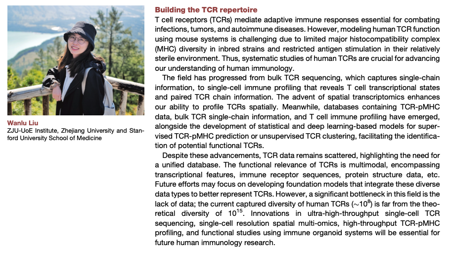 Researcher Wanlu Liu from the Zhejiang University-University of Edinburgh Institute (ZJE) was invited to contribute a Voices article to Immunity, entitled "Building the TCR Repertoire". The article provides a systematic exposition of recent advances and emerging challenges in T cell receptor (TCR) research within human immunology, offering innovative perspectives and insights that further the development of the field.